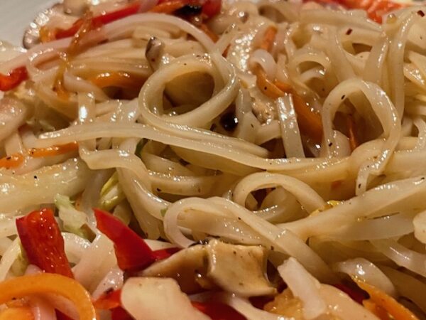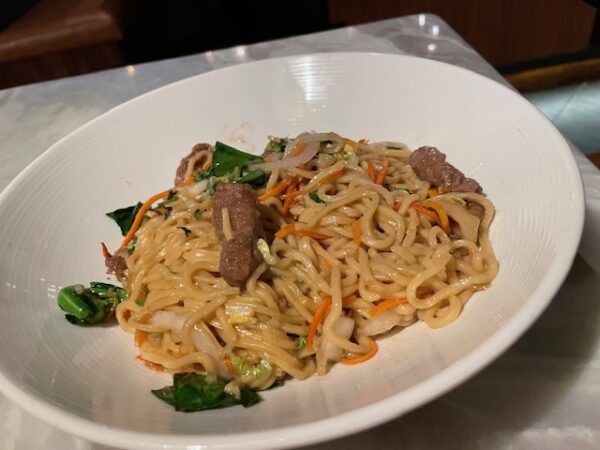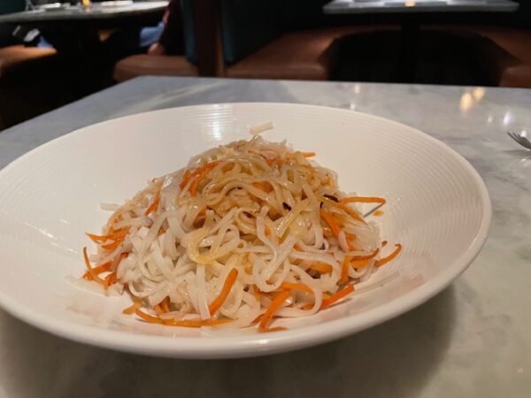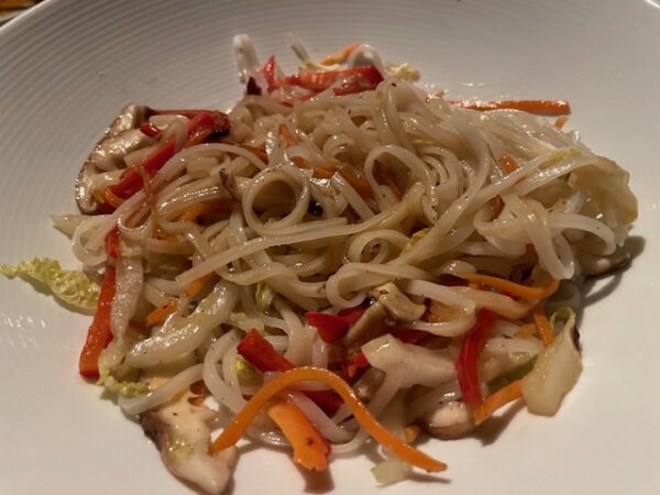 Our meal consisted of chow mein with shitake and gallan, but I opted to substitute the gallan for a mix of carrots, cabbage, and red bell peppers. We also made sure to request it gluten-free. Meanwhile, my meat-eating partner enjoyed the NY strip & Gai Lan Lo mein, which featured a dry-fried NY strip, cumin, chili-headed mushrooms, and carrots.